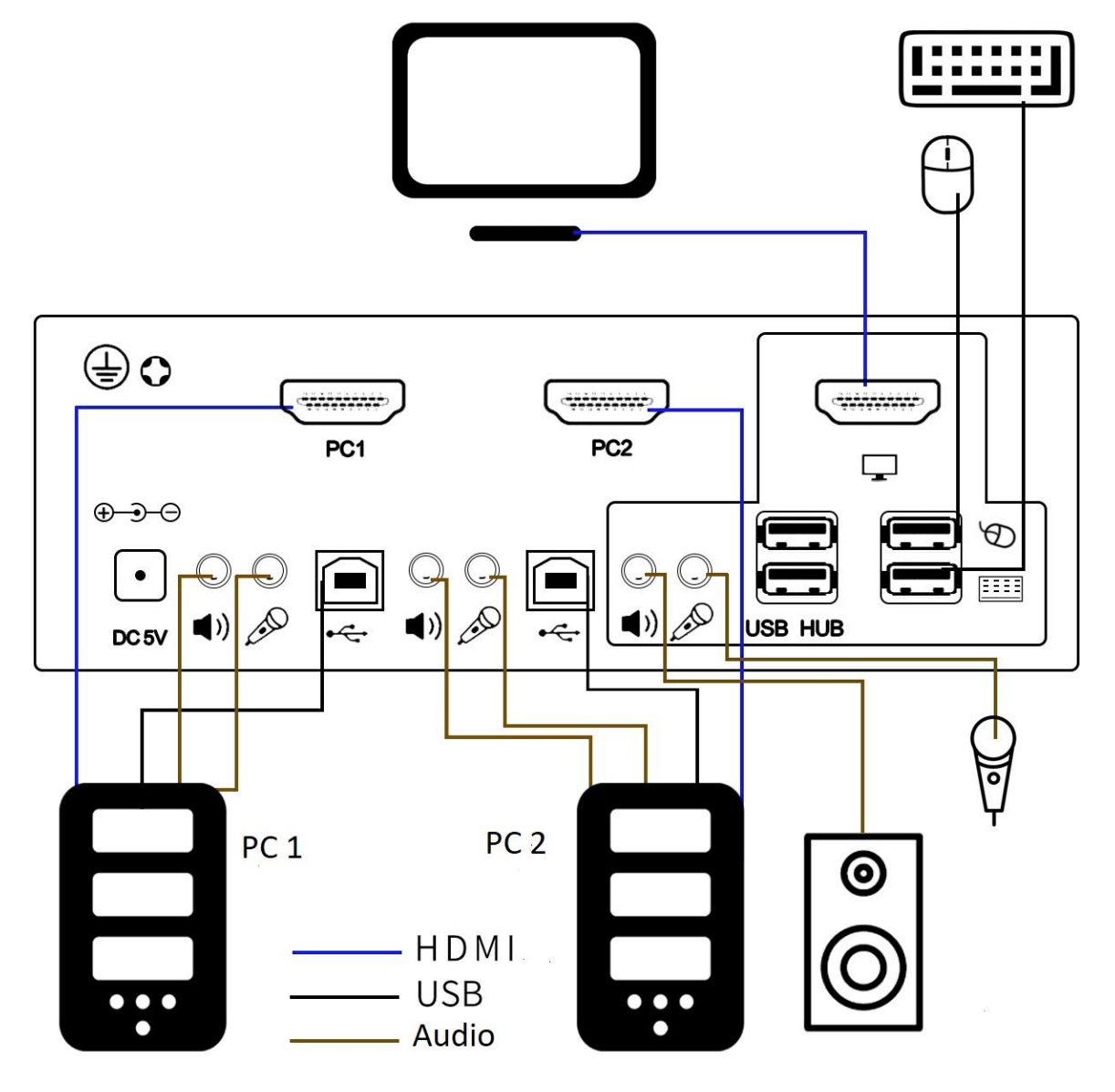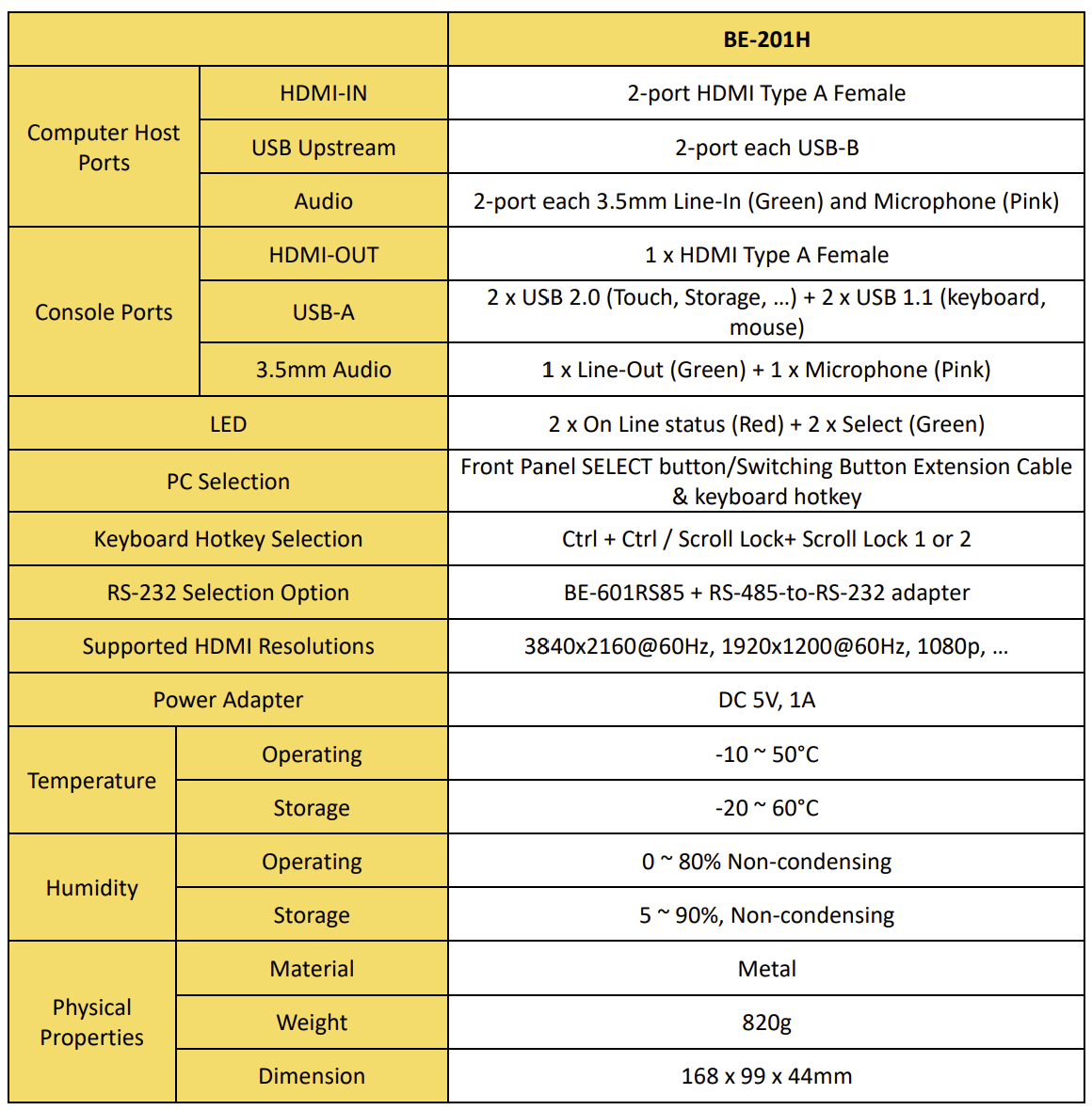 The BE-201H is an economical and compact 2-port HDMI KVM switch that provides users with the ability to control two computers through a single console interface consisting of an HDMI monitor, USB mouse, USB keyboard, and audio and microphone devices.