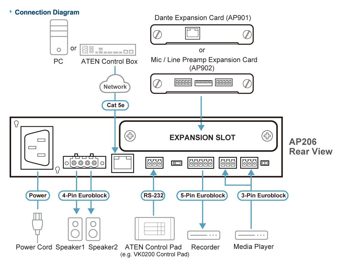 - Expansion slot for add-on expansion card – Install AP901 2-CH Dante Expansion Card to make the sound system compatible with Dante network or AP902 2-CH Mic/Line Pre-AMP Expansion Card to receive two channels of mic / line input signals