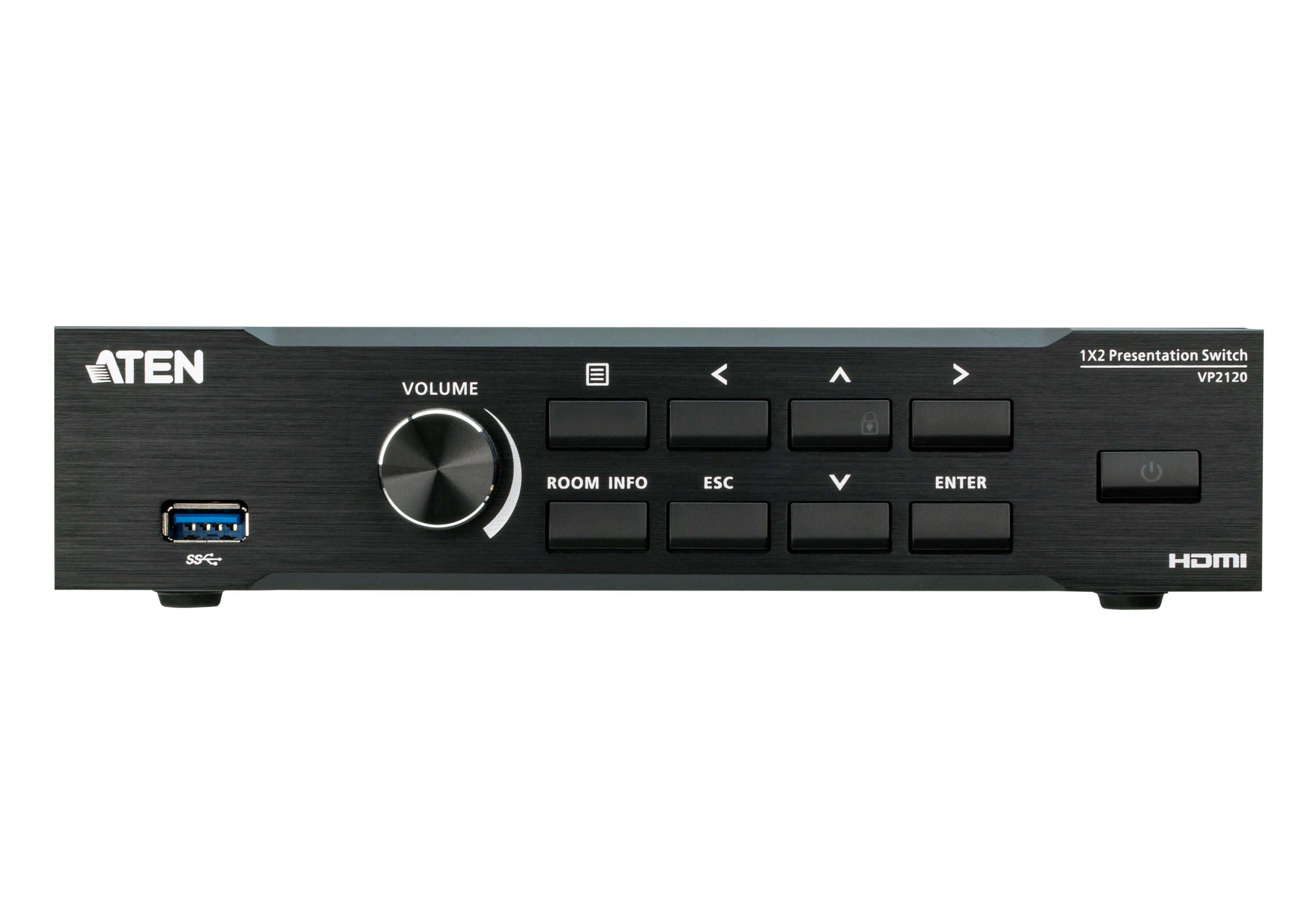 The ATEN VP2120 Seamless Presentation Switch integrates video matrix switch, AV streaming, audio mixing, and collaborative functions into one compact device.
