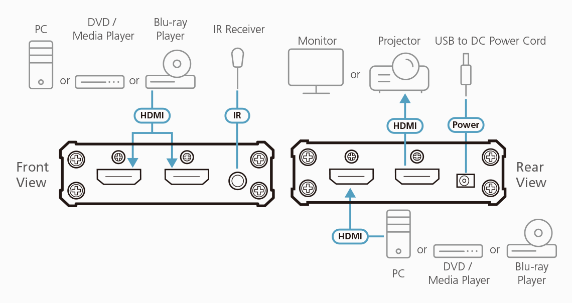 | Power | 1 x DC Jack Note: ATEN strongly recommend to use the USB via USB to DC cable (supplied) and a 5V/0.5A power adapter (self-supplied) as the main power source for the unit. The power supply from the HDMI connection may be insufficient for the unit to operate fully. |