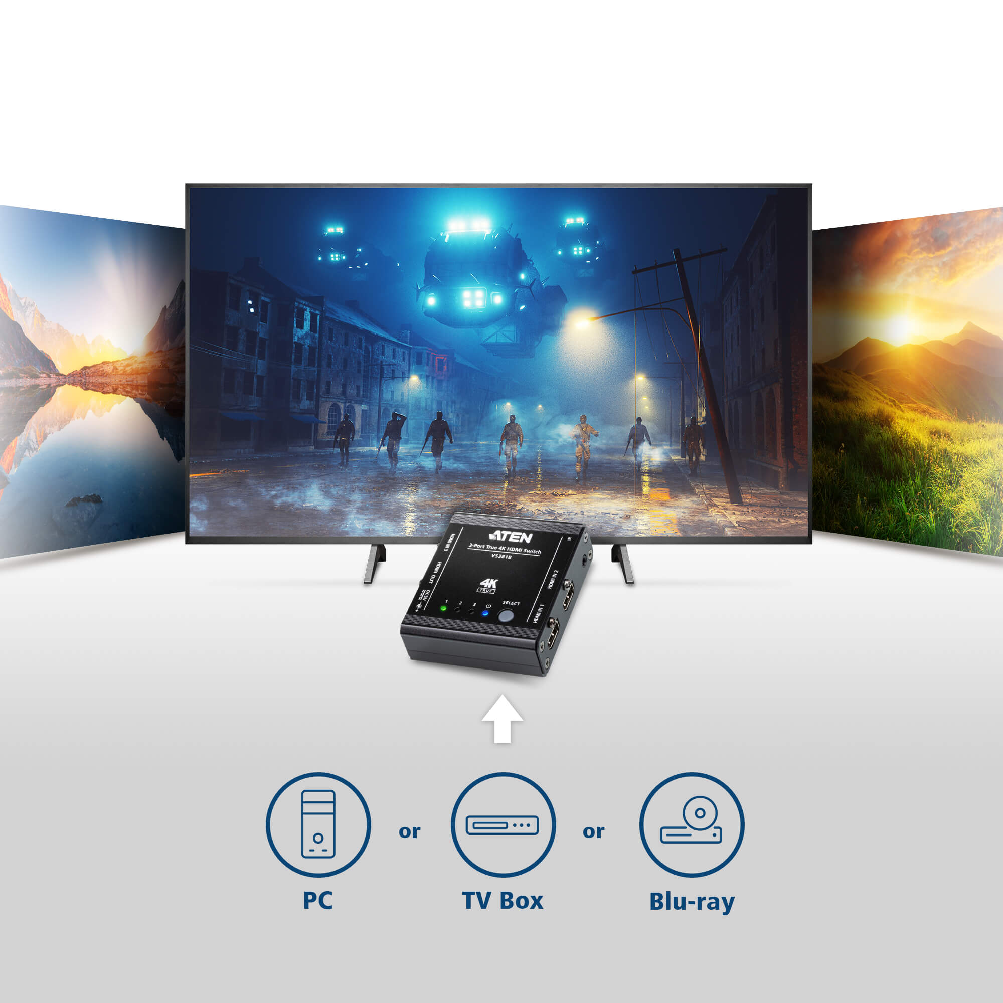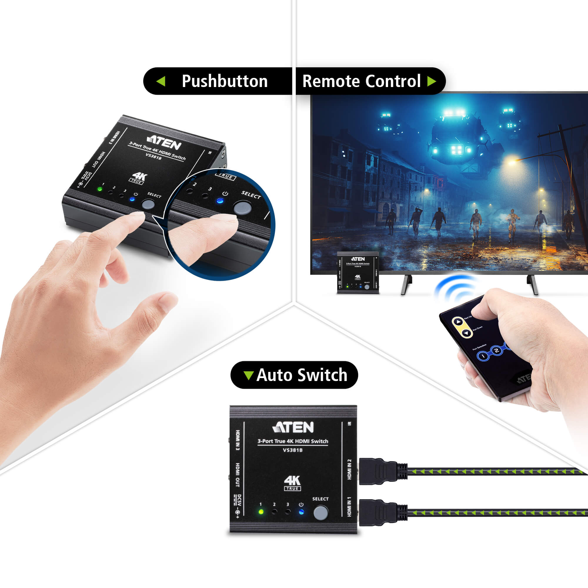 - 1x VS381B 3-Port True 4K HDMI Switch
