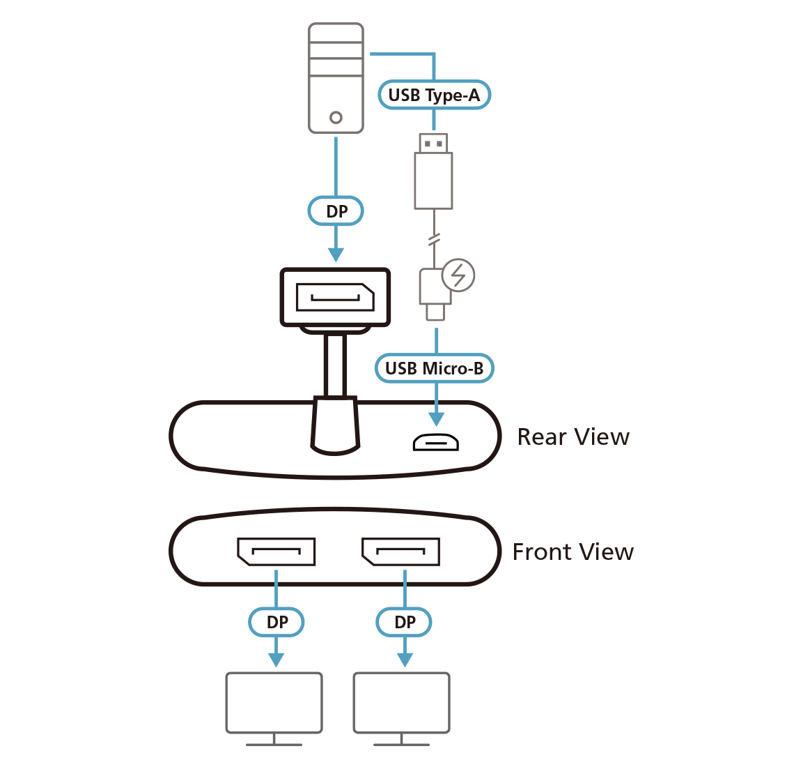 | Status | DisplayPort Output x 2 (Blue) Power Input x 1 (Blue) |