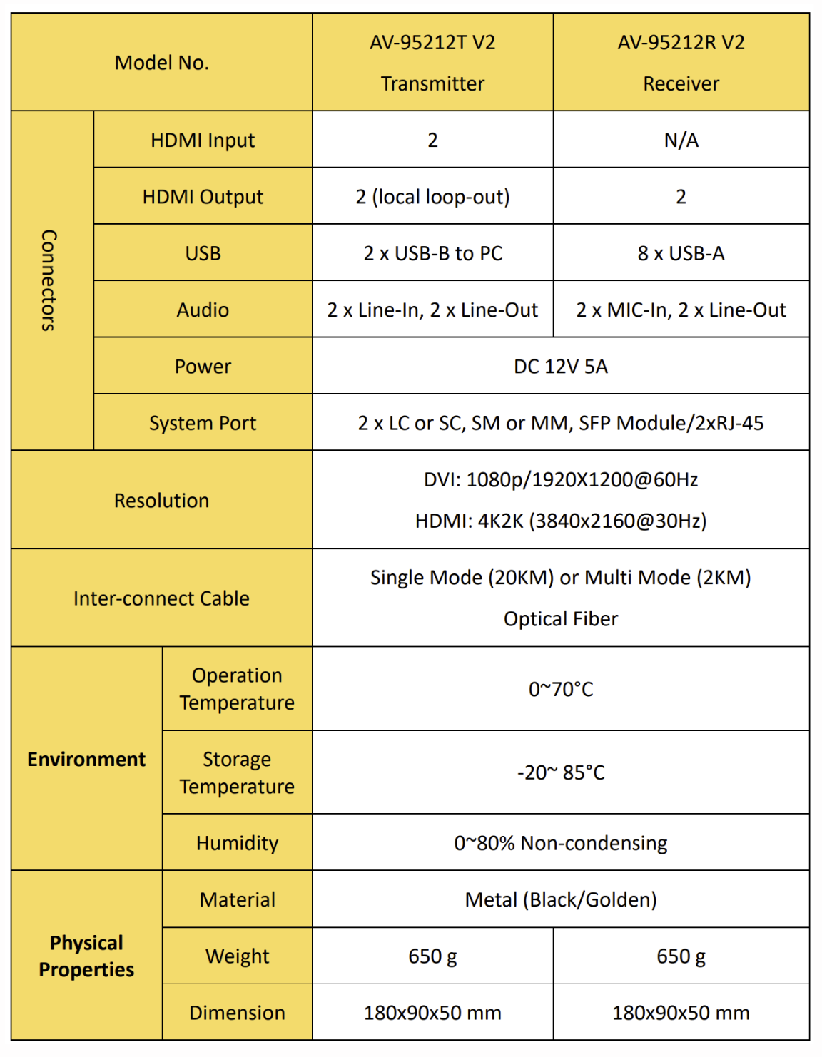 AV-95212 V2 – Dual-Head 4K HDMI + USB KVM Extender over SFP Optical Fiber / CAT6