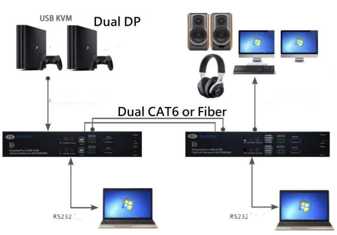 In addition to high-resolution video, the extender supports USB peripheral devices, analog audio, and 2-way RS-232 communication, offering full interactivity and control over long distances. With plug-and-play setup and no software installation required, the DP-962B delivers a simple yet powerful solution for dual DisplayPort extension in complex professional AV installations.