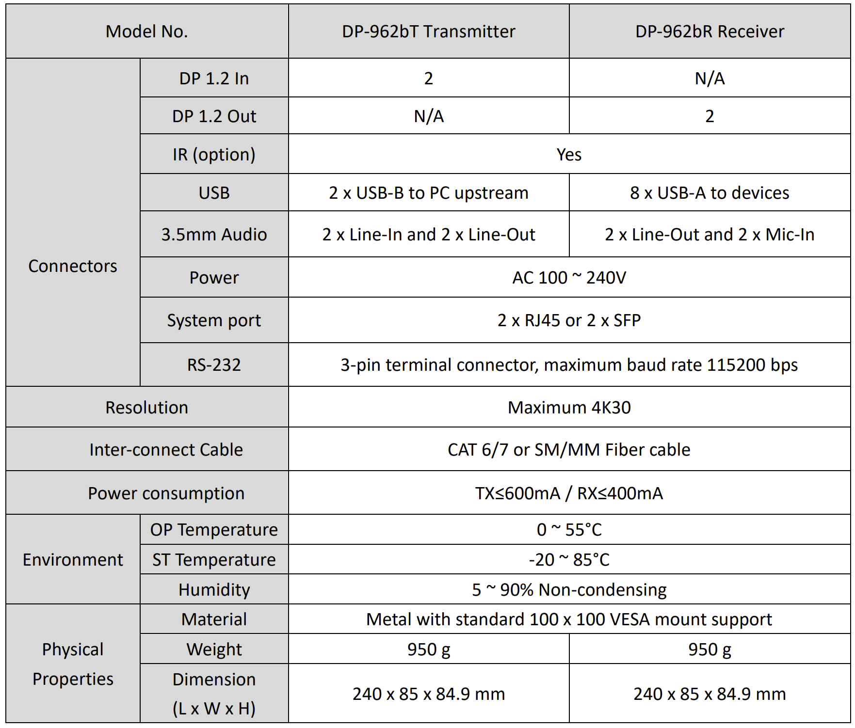 The DP-962B is a high-performance IP-based extender that enables the transmission of dual 4K30 DisplayPort video signals, along with USB, 3.5mm stereo audio, and bi-directional RS-232 control, over long distances with exceptional reliability and video quality. The system consists of a Transmitter unit and a Receiver unit, forming a complete point-to-point solution ideal for demanding professional AV environments.