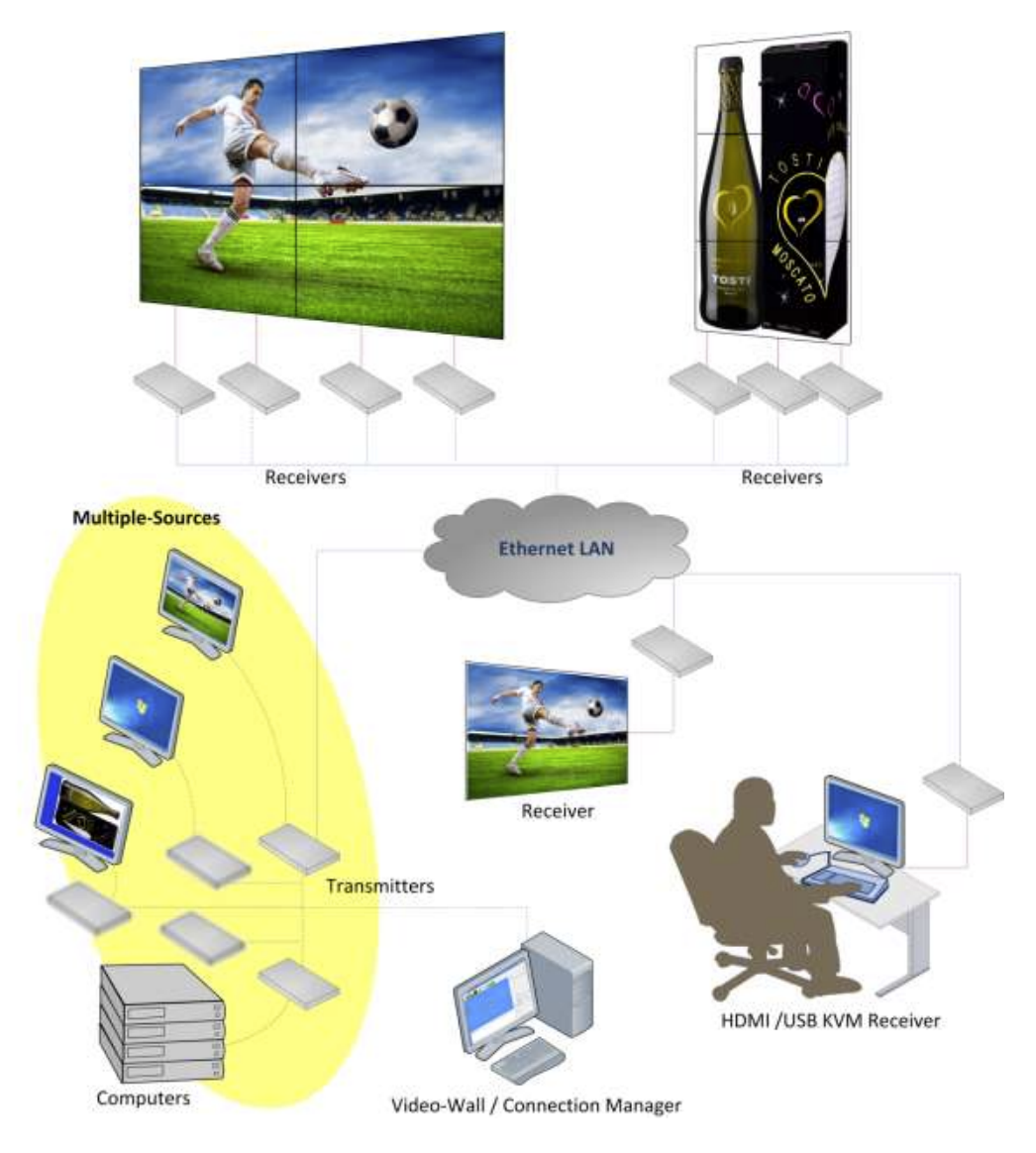 One of the standout features of the DV-9525 is its support for Video Wall configurations. With multiple receivers, users can easily configure large-scale, synchronized displays—perfect for command centers, digital signage, entertainment venues, boardrooms, courtrooms, military applications, medical displays, and educational environments. The system also supports KVM matrix control, making it ideal for applications that require remote desktop access and control.