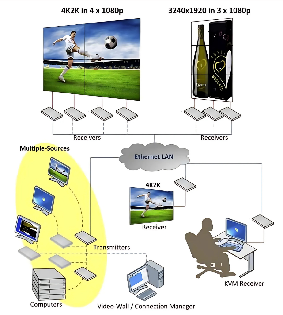 The transmitter connects to your 4K video source (PC, Blu-ray player, etc.), while the receiver connects to displays, speakers, USB peripherals, and other devices. The AV-9530 utilizes advanced encoding to convert video, audio, and USB into IP packets for distribution over a Gigabit Ethernet switch, and then back to AV signals at the receiver end.
