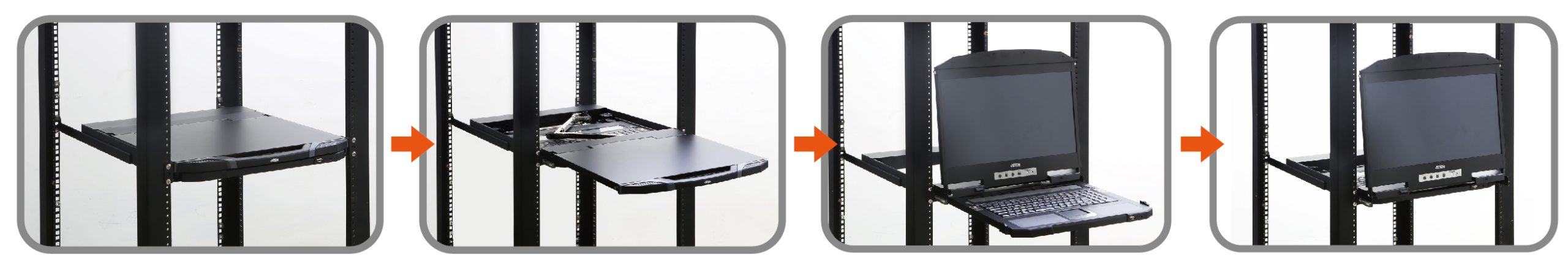 Furthermore, the dual rail design enables the LCD monitor, keyboard and touchpad to operate independently of each other. To maximize space utilization, the keyboard and touchpad modules can slide back to “hideaway” when not in use, while the thin profile LCD monitor rotates back, flush against the rack, to allow the convenient monitoring of computer activity.