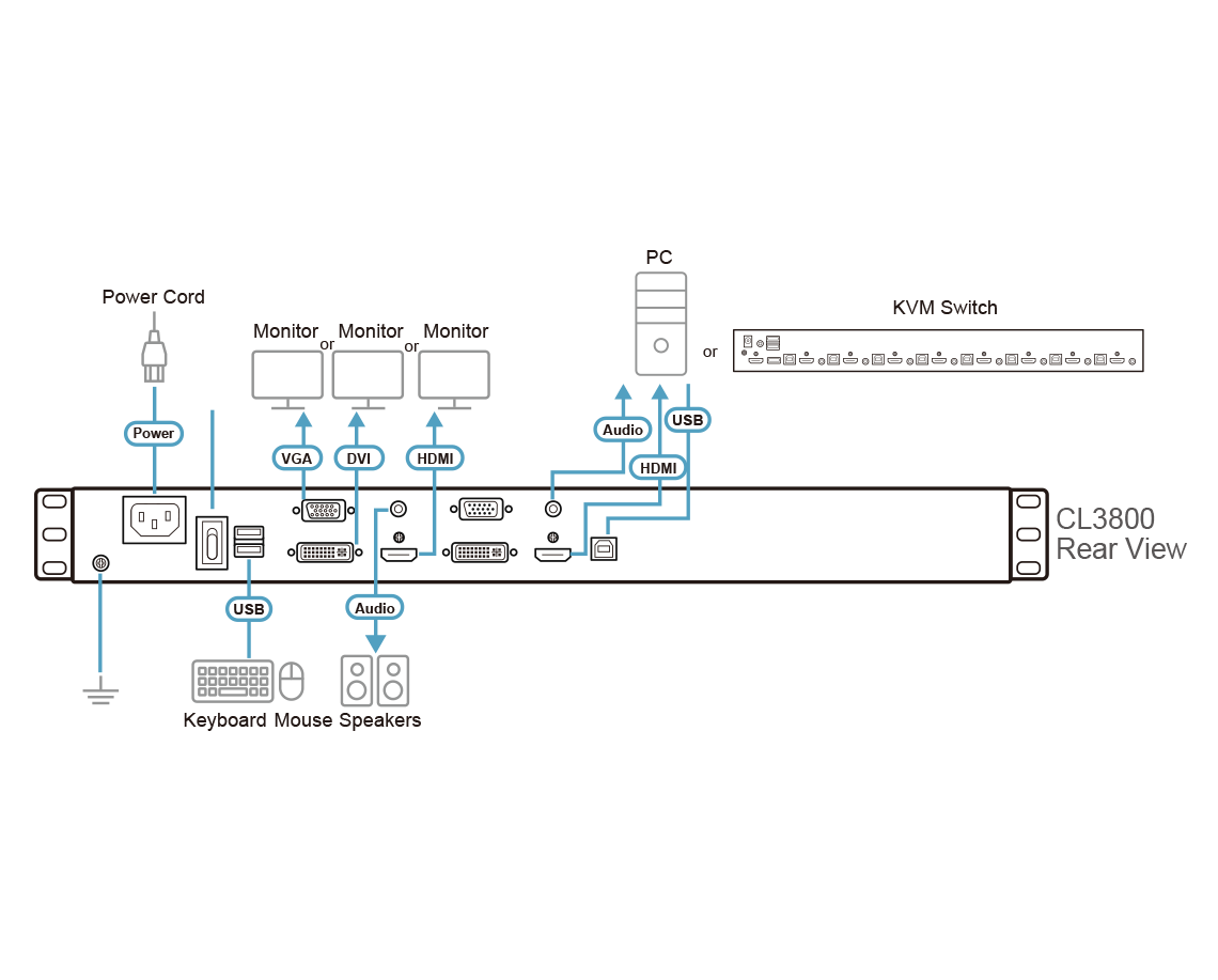 For added convenience, users can choose to manage the computer from an external console. The CL3800 features a port for an external USB mouse on the unit’s front panel, while ports for the second KVM console (USB keyboard/mouse and HDMI, DVI, or VGA monitor) are provided on the rear panel. The CL3800 also includes two mini stereo ports for connecting audio speakers.